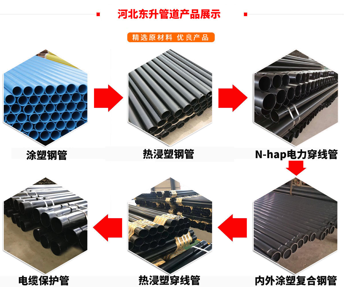 我公司所生產的熱浸塑鋼管、N-hap電力穿線管等系列產品,采用環保原材料,外觀漂亮,表面平整